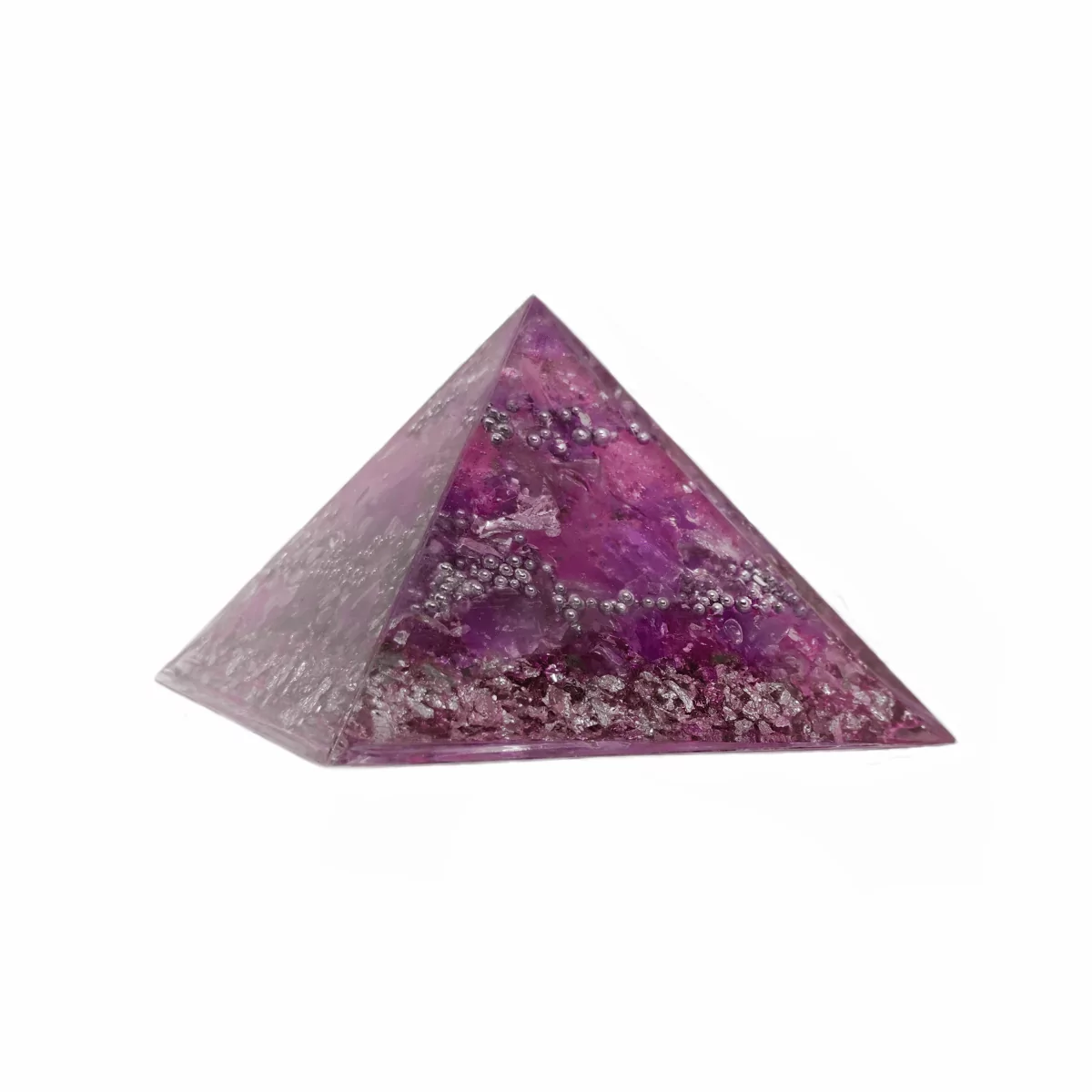 “Als leichte Form des Traumwandel ist diese Akasha Orgonit Pyramide dem blasseren, pinken Amethyst gewidmet. Durch die stärkere Anwendung von Anhydrit und nahezu verblassten violetten Elementen eignet sich diese hervorragend für hochsensible Gemüter, welche dem Kosmos zum Greifen nahe kommen möchten.”