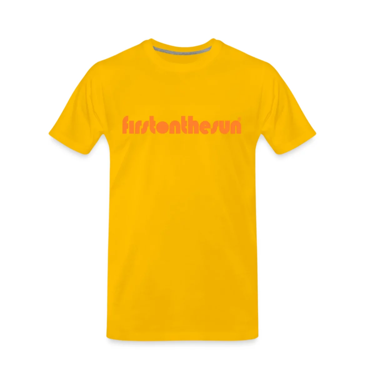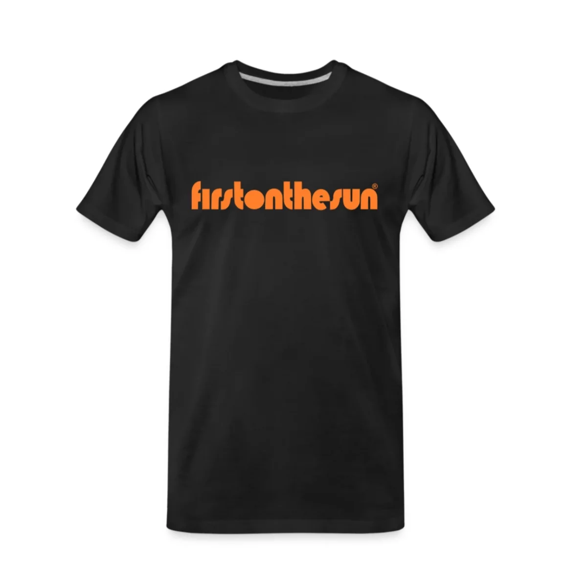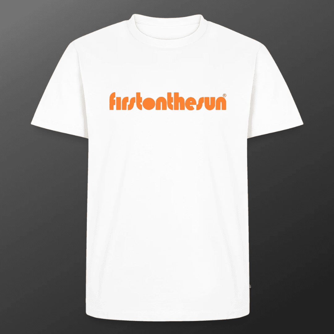 Das klassische firstonthesun® T-Shirt mit orangenem Schriftzug – Standardmäßig in Weiß, zunehmend auch in anderen Farben verfügbar.