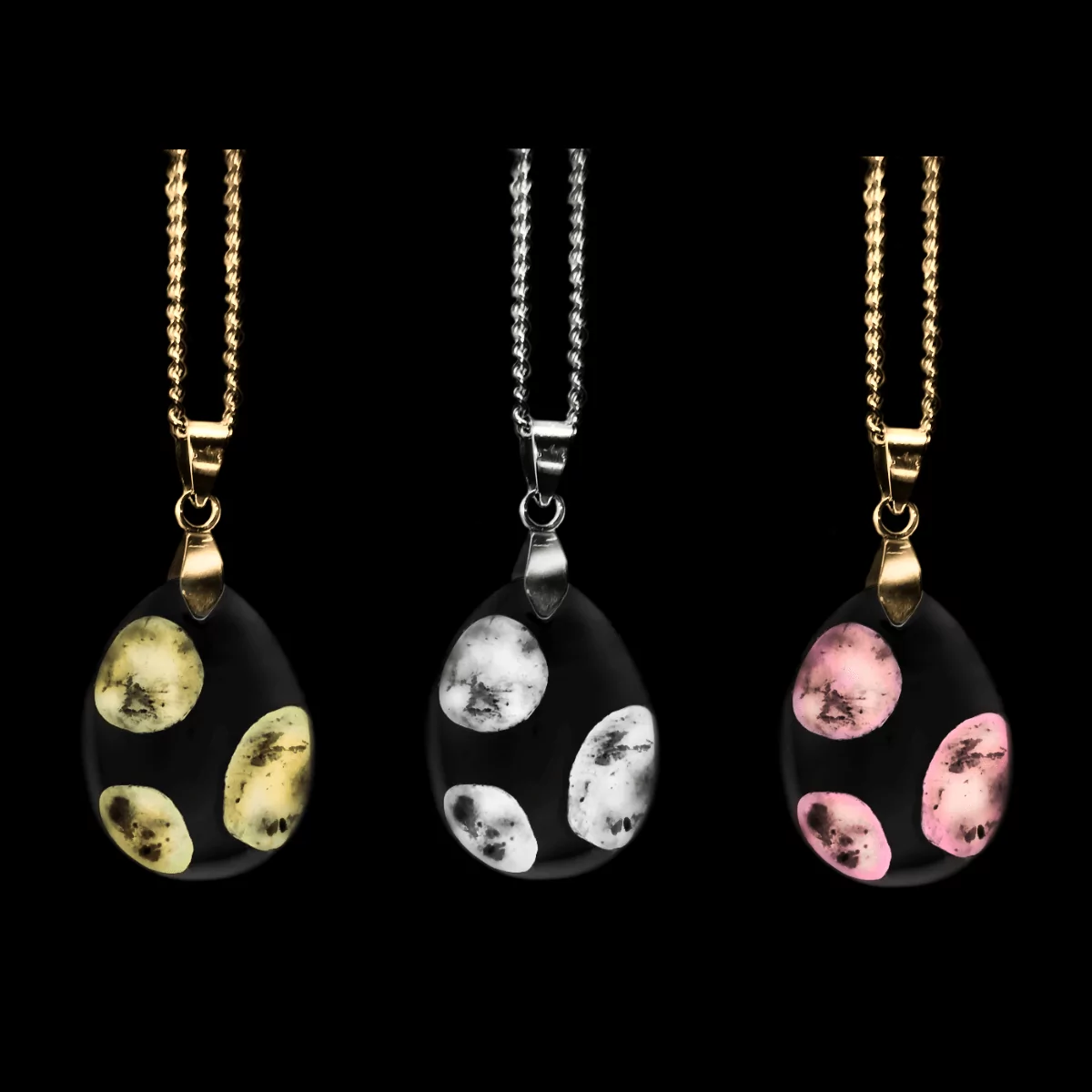Dieses Produkt gibt es in 3 Lichtpunkt-Variationen, welche entweder 925-Silber + Legierung, Gold + Legierung oder Gold + Roséfarbene Legierung enthalten und den atemberaubenden Glanz dieser Edelmetalle offenbaren. Auf dem Produktbild sehen Sie 3 mögliche Variationen. Bis auf diese Lichtpunkte ist jedes Schmuckstück in einem tiefen Schwarz gehalten, welches eine undurchdringliche Hülle formt, sodass negative Energie stets durch diese 3 vorhandenen Formationen ausgesandt werden. Dieses Schwarz ist momentan noch keiner Signature-Coloration zuzuordnen. Diese Kreation aus der Collectors-Serie eignet sich als energetischer Schmuck besonders zur Öffnung des Wurzelchakras.