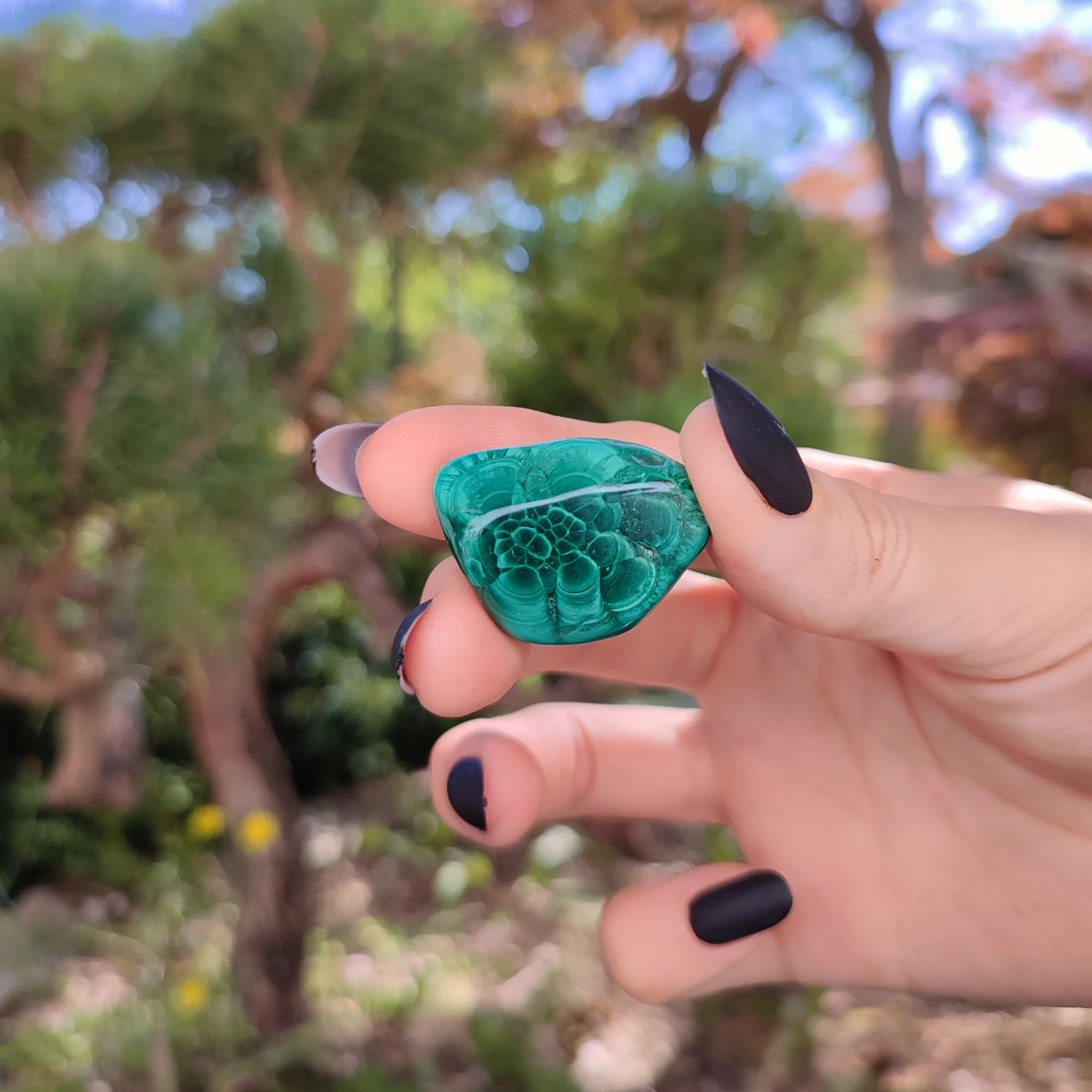 Mit edlen Malachit-Trommelsteinen kann das märchenhafte, natürliche Band der Urkraft der Edelsteine immerzu erlebt werden.