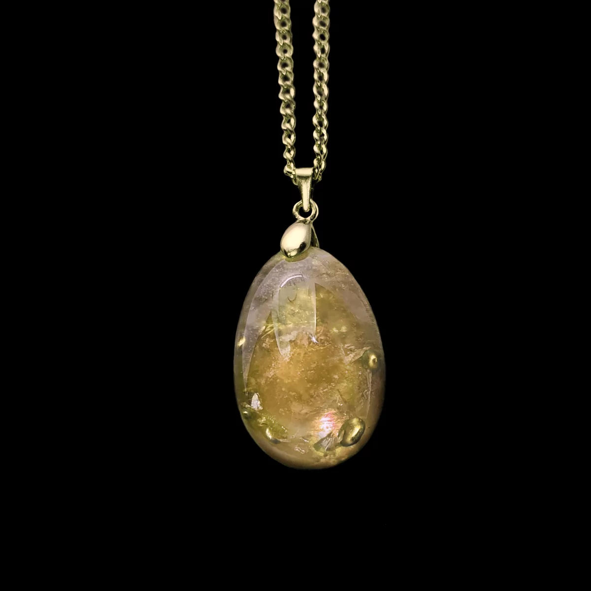 Unser Orgonit-Amulett “Champagne” beinhaltet als führende Position eines Lichtbringers der “Champagner Orgonite” deren klassische alchemistische Farbgebung, welche eine weiche, ausgebleicht erscheinende Signature Coloration von “Golden People” zu verkörpern vermag. Besonders interessant an den hierfür genutzten Edelsteinen, welche primär aus derb strukturierten beigen Quarzen, Citrinen, Bergkristallen, Herkimen Diamanten & Spessartinen [Gelber Granat] besteht, ist ihr breites Spektrum an außergewöhnlicher Struktur, welches von solidem gelb, durch Hämatit veredelte Kristalladern & schimmerndem, spektral anmutenden Glanz durchzogen ist.