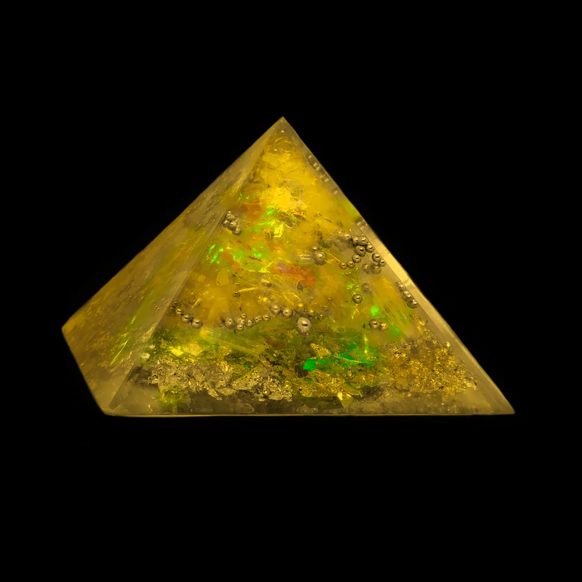 Der “Golden People” Orgonit wurde entwickelt um Ihre Stunden und Momente zu vergolden. Für eine einzigartige Optik ist diese Pyramide von allen Seiten opalisierend, das heißt, dass er je nach Blickwinkel ein Farbenspiel aus leuchtendem Gelb, Orange & hellem Grün wiederspiegelt.
