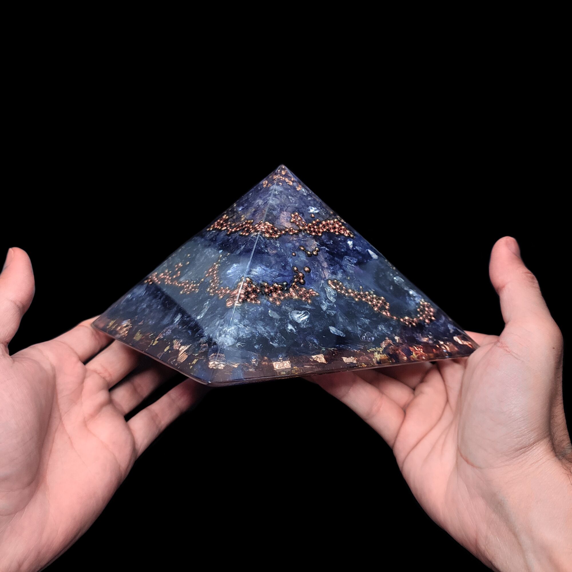 In zartem, doch ausdrucksstarken Enzian-Blau schillern in der “Gentiana” Orgonit Pyramide die Edelsteine Tansanit, Saphir, Aquamarin, Herkimer Diamant, Bergkristall & Lemurian. In Kombination mit Kupferfarbenen, sowie Roségoldenen Metall-Elementen bringt dieser Premium Orgonit eine vollkommen neue Ästhetik, welche jeden Wohnraum in eine energetische Wohlfühloase voller Prunk verwandelt. Dem Kehlchakra zugeordnet ist die Orgonit Pyramide “Gentiana” besonders gut für kommunikative, gesellige Gemüter geeignet & kann dabei helfen, soziale Barrieren bedacht zu überwinden.