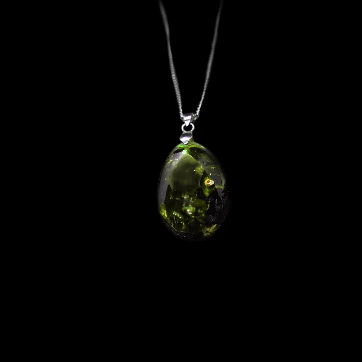 Dieser Orgonit-Schmuck Anhänger in Grün enthält viele kleine Peridot-Edelsteine, welche in alchemistische grüne Lava geformt wurden. Umschmeichelt wird dieses interessante Farbenspiel von Schungit, Schwarzem Turmalin, Obsidian, Laserkristall & Herkimer Diamant.