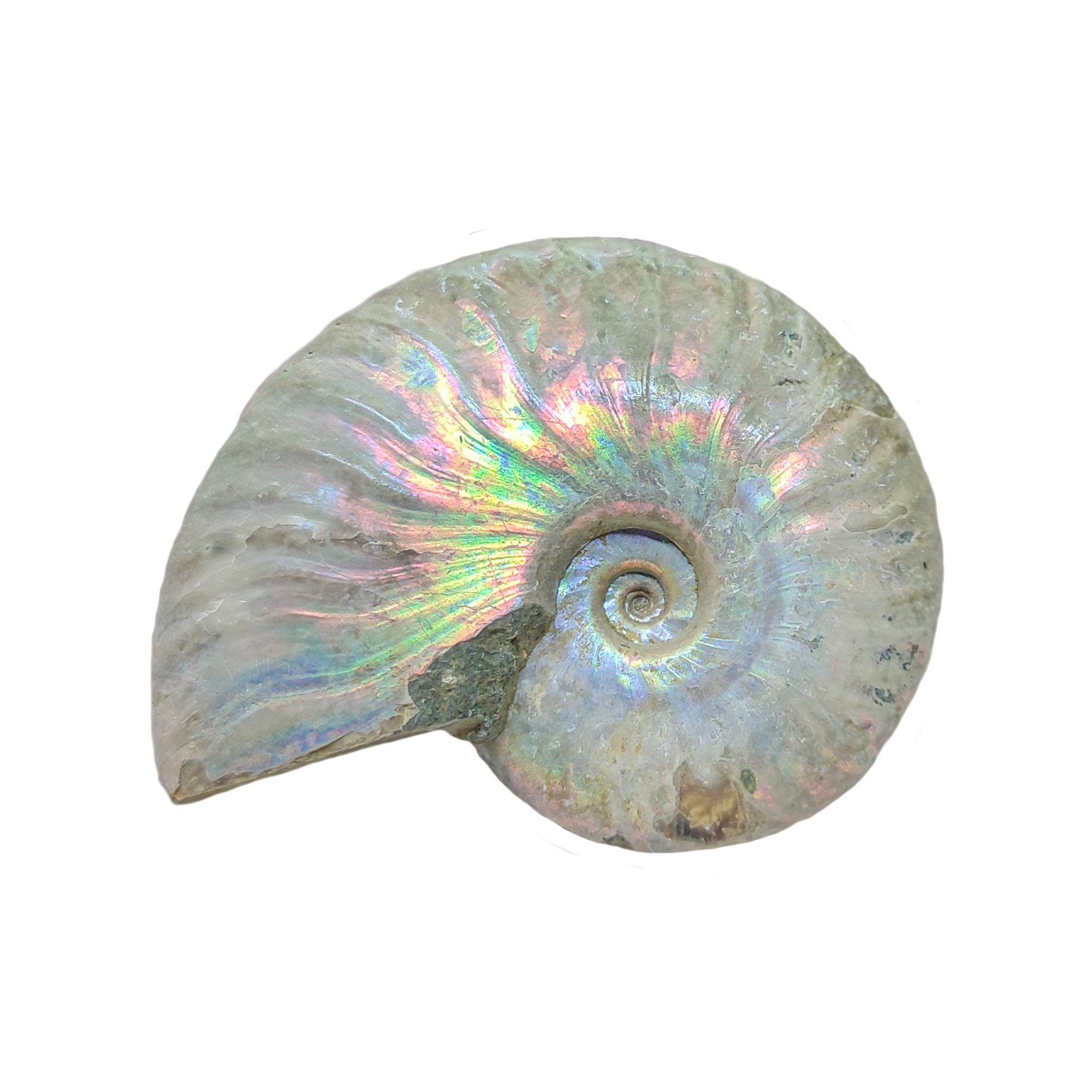 Cremefarbener Perlmutt-Ammonit mit regenbogenfarbenem irisierendem Schimmer.