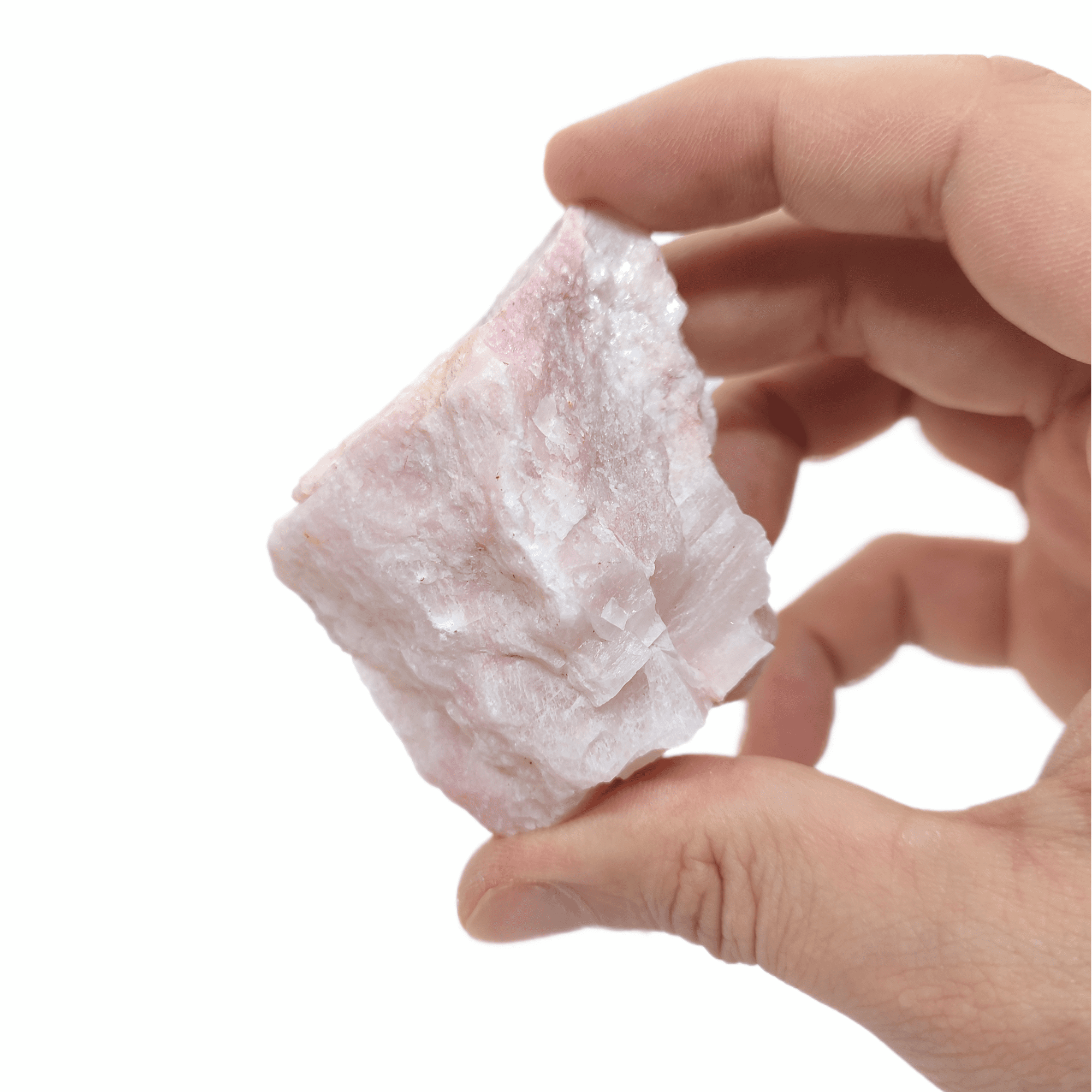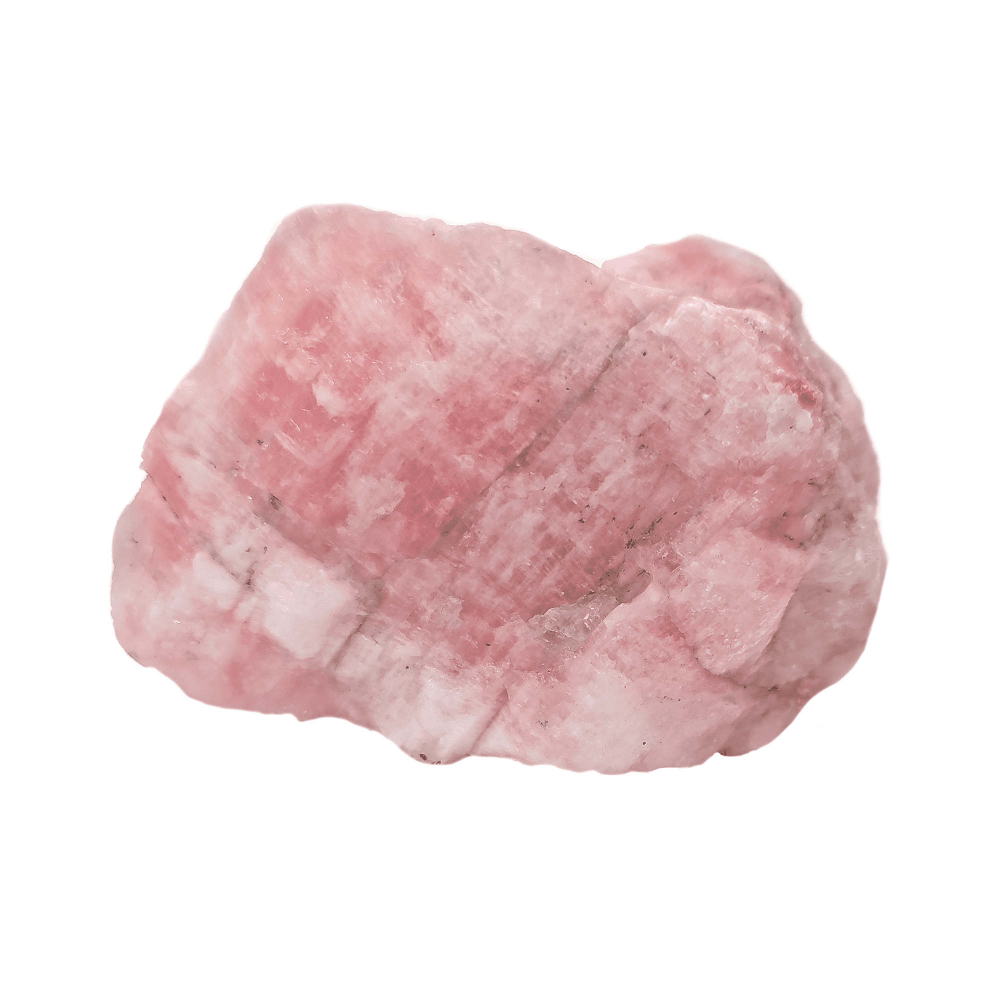 Ein rosafarbener Petalit Rohstein. Dieser Kristall erinnert an Rosenquarz.