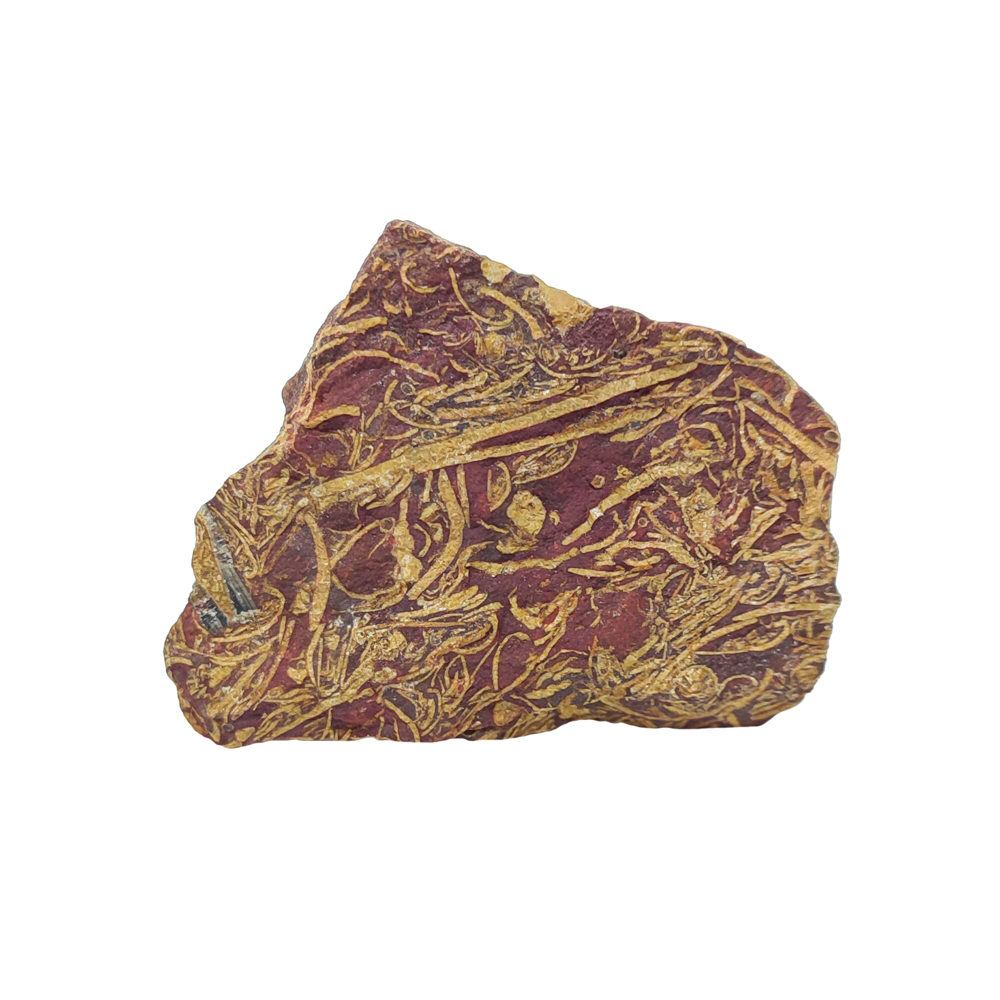 Rotbrauner Schlangenjaspis Rohstein mit charakteristischen beigen Kristall-Adern, welche an ein Schlangenmuster erinnern.