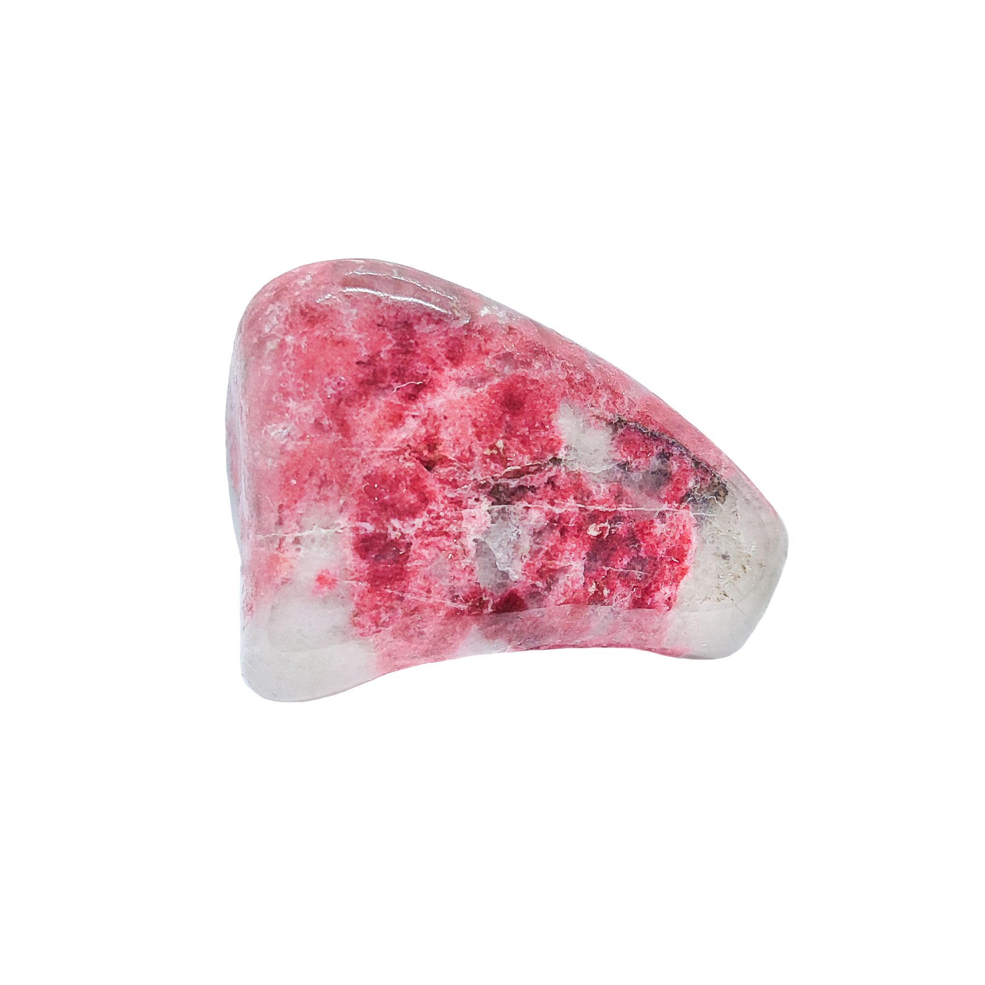 Rosa-roter Thulit Trommelstein [Zoisit] mit weißen Kristall-Arealen.